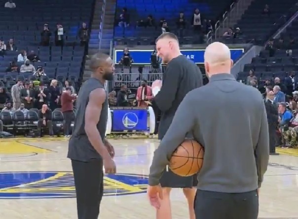 赛前热身环节,勇士新援波尔津吉斯来到场地中央,和前队友杰伦·布朗寒暄几句。