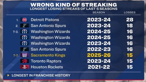 国王本赛季的15连败已创队史最差纪录