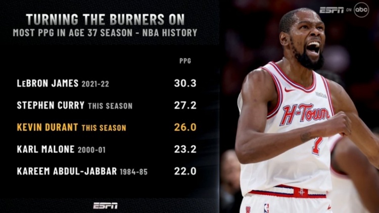 史上37岁赛季场均得分:22年詹姆斯30.3分第1 本季库里&KD分列23