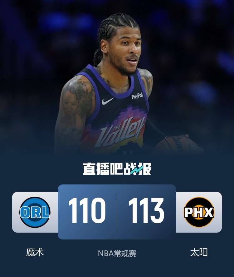 比赛开始,太阳十分慢热打了近3分钟才拿到首分,狄龙三分止血,但魔术外线连续三分拉开双位数领先,太阳连续杀伤追到差4分,次节太阳7-0后连续三分一度反超,魔术回应7-0稳住局势,杰旺·卡特接连三分重新拉开双位数领先。下半场,狄龙手部受伤不会回归,马威连续内线取分再次帮助太阳反超,双方展开拉锯战,末节太阳接连外线发炮拉开双位数领先,魔术8-0还能咬住,古德温受伤回更衣室,布莱克连续反击暴扣直接追平,最后一攻吉莱斯皮压哨三分不中,双方进入加时。加时赛,贝恩6犯离场,但魔术还是建立5分领先,格雷森·阿伦造杀伤后再三分带领太阳7-0反超2分,班凯罗暴扣再追平,马威空接不中,双方进入第二个加时。双方持续胶着,杰伦·格林罚球不中但命中高难度拉杆上篮领先到3分,艾萨克关键两罚不中,杰旺·卡特三分再追平,杰伦·格林压哨三分绝杀,最终太阳双加时113-110战胜魔术。