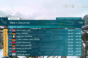 男子钢架雪车第1组赛果:三位中国选手分别排在第5、第8、第12