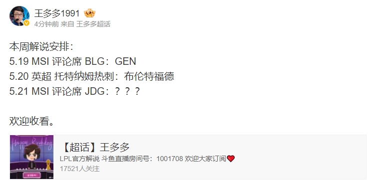 直播吧5月19日讯 今日LPL官方解说王多多分享自己本周解说预告,19日与21日解说英雄联盟MSI,20日将做客英超解说热刺VS布伦特福德。