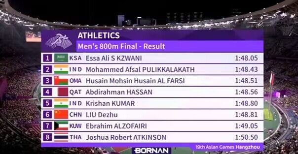 >亚运会男子800米 中国选手刘德助因犯规被取消比赛成绩