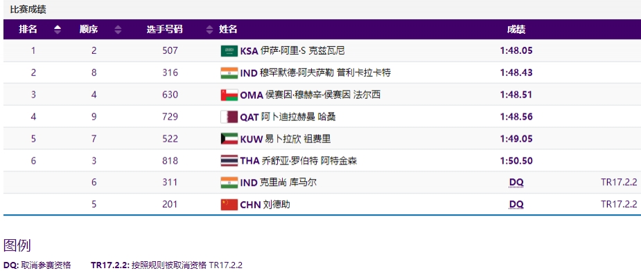 刘德助1分48秒81排名第六,但赛后他最终因犯规(推挤/阻碍 jostling / obstruction)被取消比赛成绩。