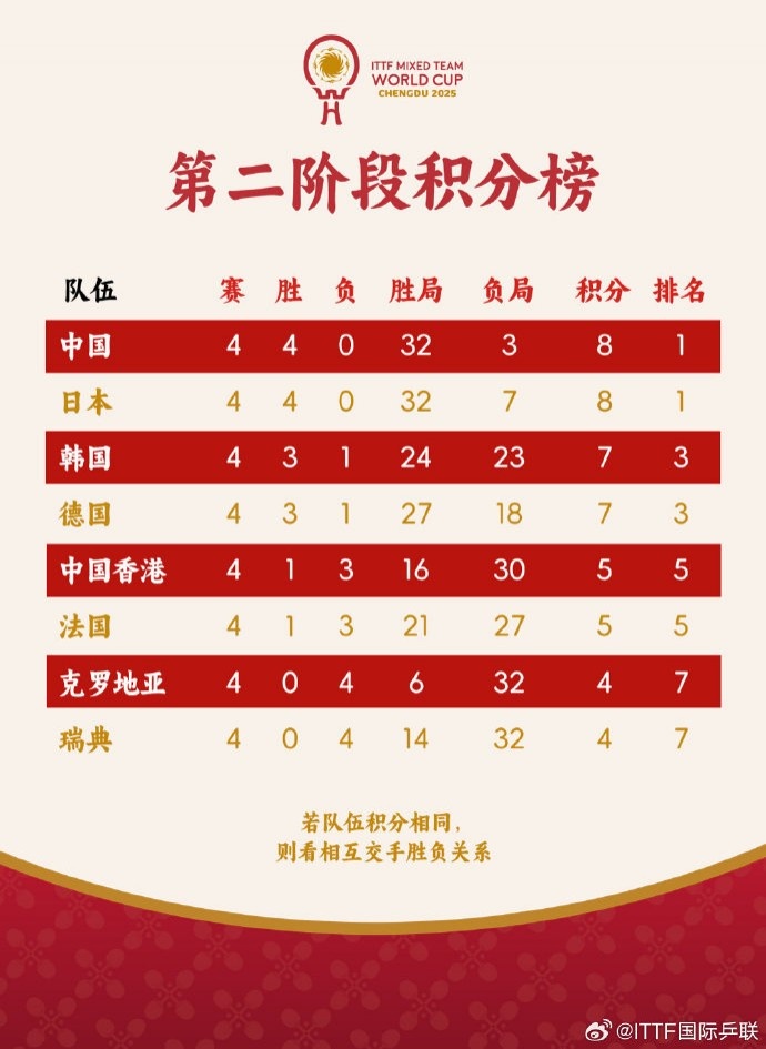 直播吧12月4日讯 2025年成都混合团体乒乓世界杯第五日结束截至目前第二阶段,中国队4战4胜积8分排名第一,韩国排名第三,德国排名第四,中国香港排名第五。