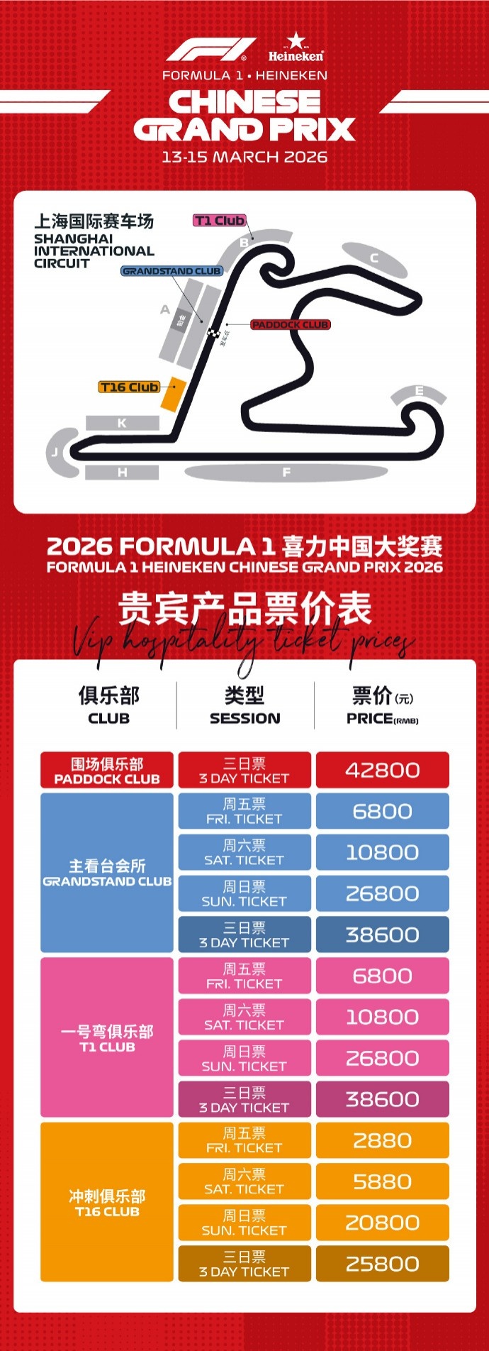 直播吧12月5日讯 F1中国大奖赛官方公布2026年票价,周五至周日三日票最低480元,最高4680元。