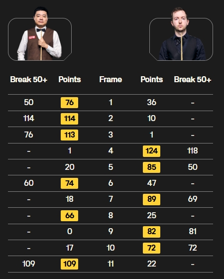丁俊晖打出两杆破百(114、109)和三杆50+(50、76、60),唐纳森打出一杆破百(118)和四杆50+(50、69、81、72)