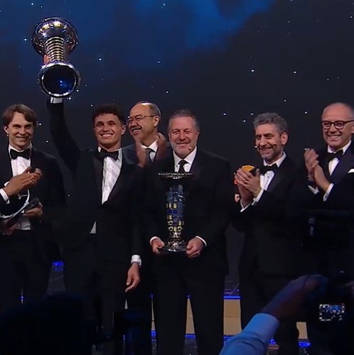 直播吧12月13日讯 FIA年度颁奖典礼今天凌晨进行,新科世界冠军诺里斯在FIA年度颁奖典礼上捧起F1车手总冠军奖杯。