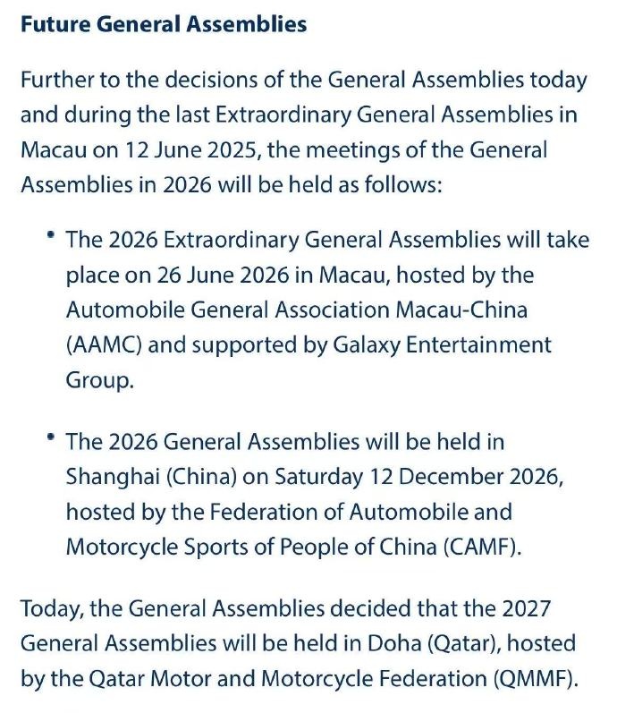 2026年全体大会将于2026年12月12日(星期六)在中国上海举行,由中国汽车摩托车运动联合会(CAMF)主办。
