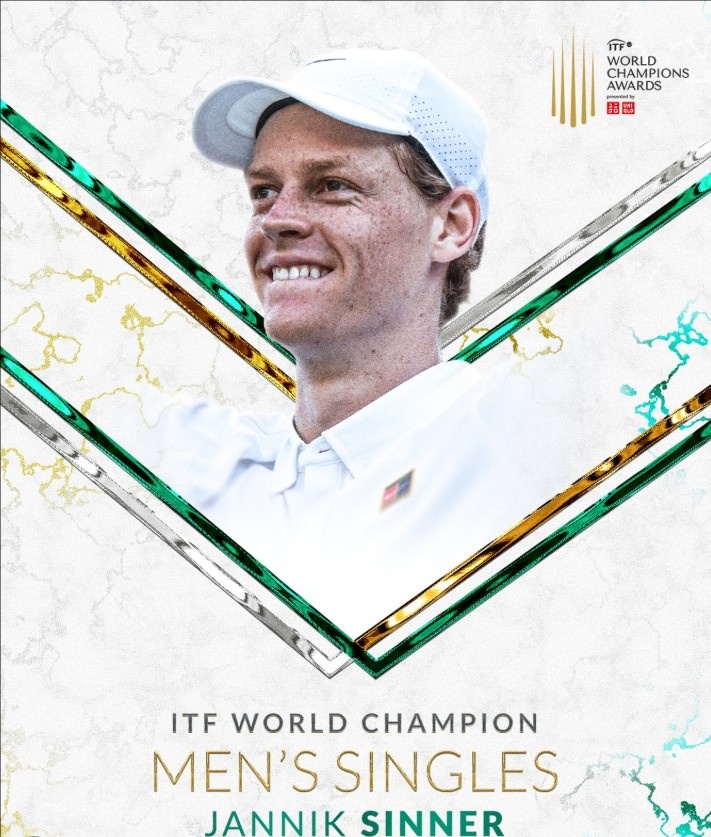 辛纳成为2025年男子单打ITF世界冠军,因他今年赢得了澳大利亚网球公开赛和温布尔登网球锦标赛的冠军。