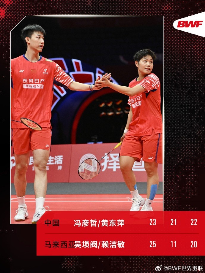 >冯彦哲/黄东萍2-1吴埙阀/赖洁敏,取得世界羽联总决赛混双两连胜