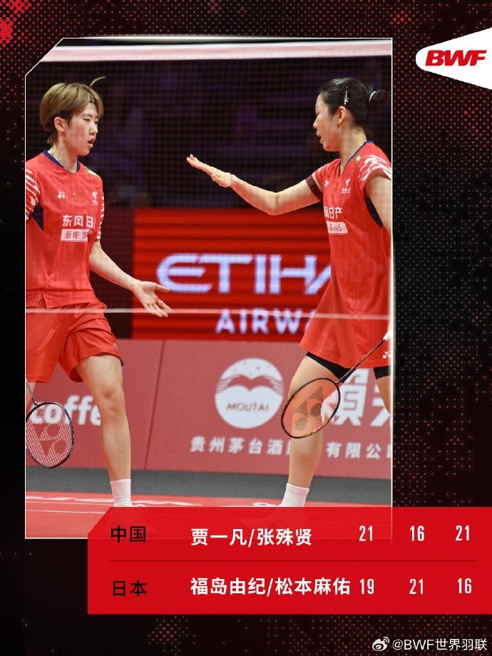 贾一凡/张殊贤2-1福岛由纪/松本麻佑,收获世界羽联总决赛首胜