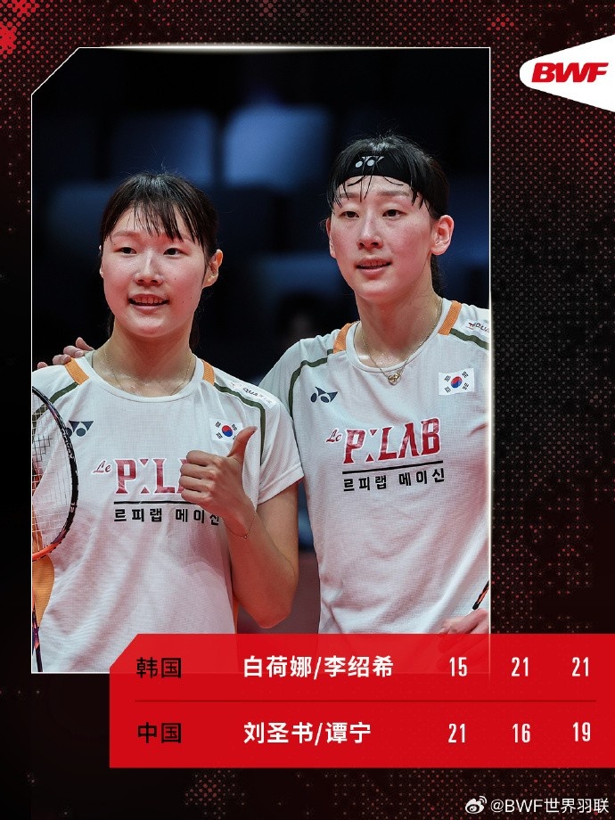 直播吧12月20日讯 2025年世界羽联年终总决赛女双半决赛,刘圣书/谭宁1-2不敌白荷娜/李昭希,遗憾止步女双四强。