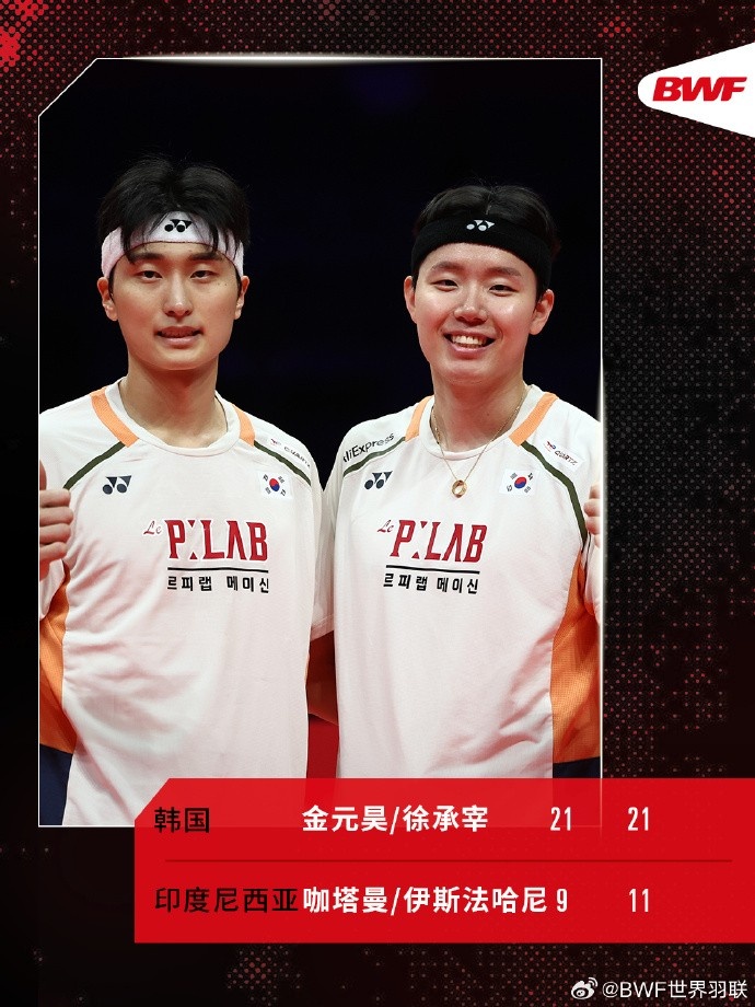 世界羽联年终总决赛男双半决赛:金元昊/徐承宰组合晋级决赛