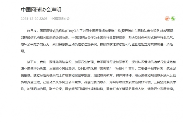 直播吧12月20日讯 国际网球诚信机构(ITIA)此前公布对中国网球选手逄仁龙处罚,禁赛12年罚款11万美元。中国网球协会对此事发布声明。