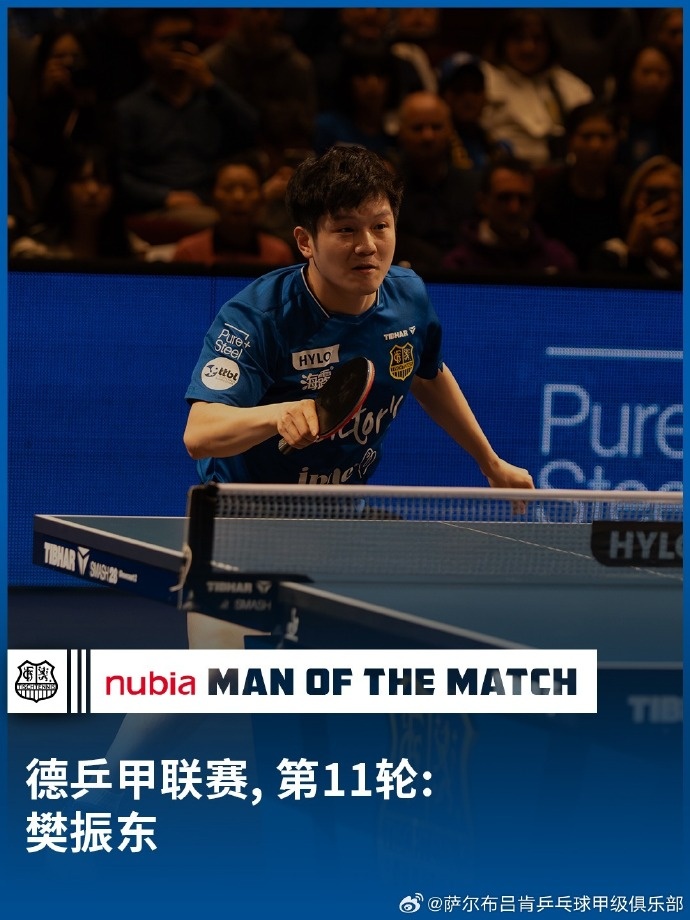 在此前的乒乓球欧冠1/8决赛次回合比赛中,樊振东同样当选全场最佳。