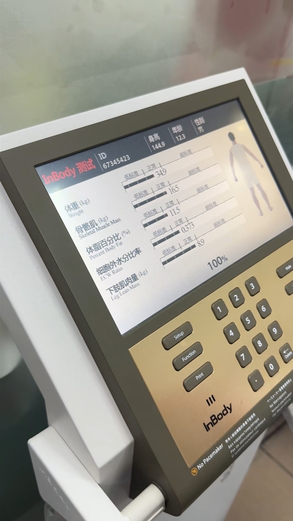 检查结果显示,12.3岁的皓皓身高144.9cm(打针前是136.6cm),体重34.9公斤,体脂11.5%。