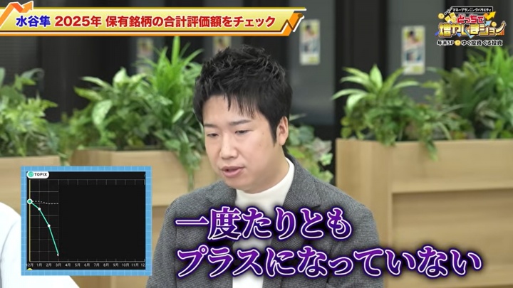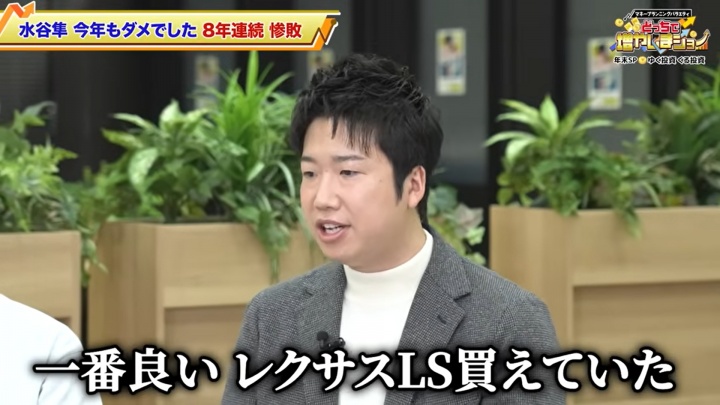 节目中提到,水谷隼2024年说“亏损足以在东京买一套房”,接着聊到“2025年的亏损够买什么?”,水谷隼感慨道:“上周我去看雷克萨斯,翻着宣传册突然想到,要是今年没投资的话,我完全能买下顶配的雷克萨斯LS。现在我的总亏损额大概相当于一套房子加一辆LS的价钱。” 由此透露2025年亏损额已达到可购置豪华轿车雷克萨斯LS的程度。