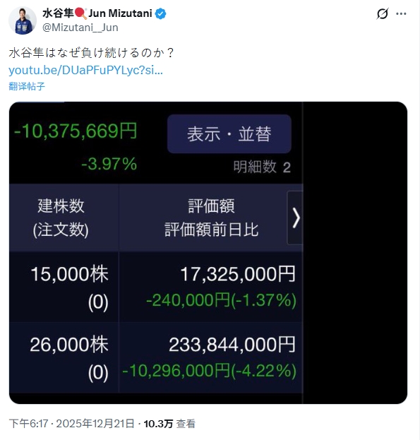 水谷隼此前曾透露,他在外汇交易中获得超过1000万日元的浮动盈利,一度大赚特赚,但后来在外汇交易中出现保证金不足(追加保证金)的情况。此外,他还曾公开交易界面,综合盈亏显示“盈利1043.9万日元(约47万人民币)”,标注“卖出获利”呈现巨额盈利,但随后又发布股票交易亏损超百万日元的截图,反复上演不稳定的交易操作。