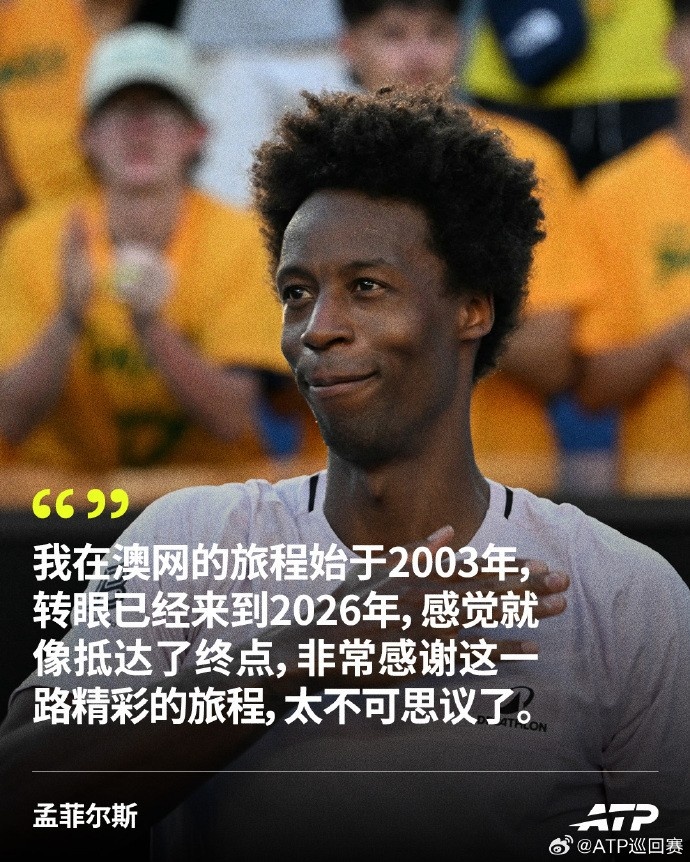 赛后,孟菲尔斯说道:“我在澳网的旅程始于2003年,转眼已经来到2026年,感觉就像抵达了终点。非常感谢这一路精彩的旅程,太不可思议了。”