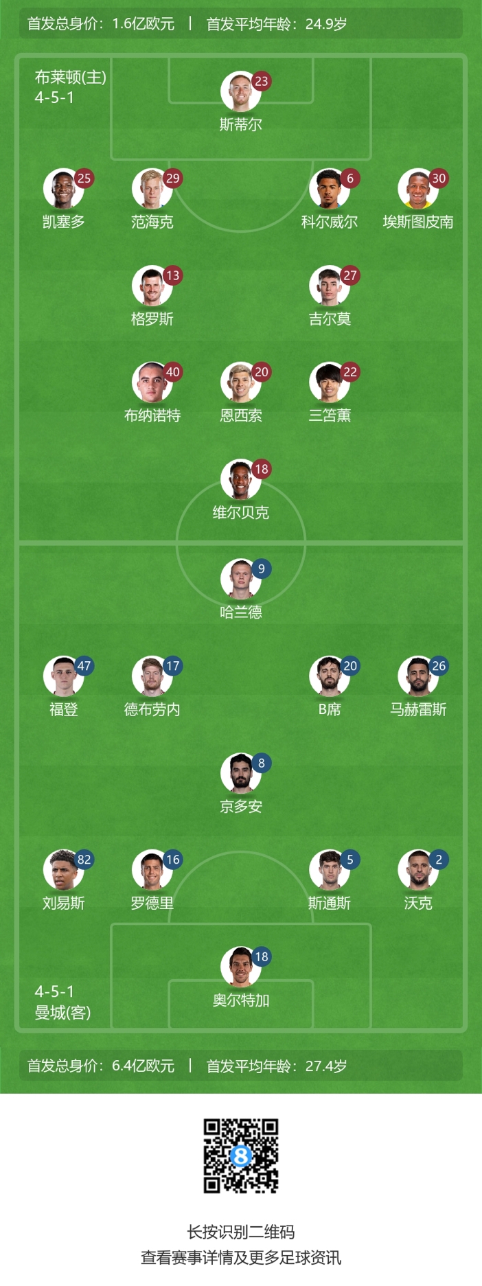曼城首发:18-奥尔特加、2-沃克、5-斯通斯、82-里科-刘易斯、16-罗德里、8-京多安、17-德布劳内、20-B席、26-马赫雷斯、47-福登、9-哈兰德
