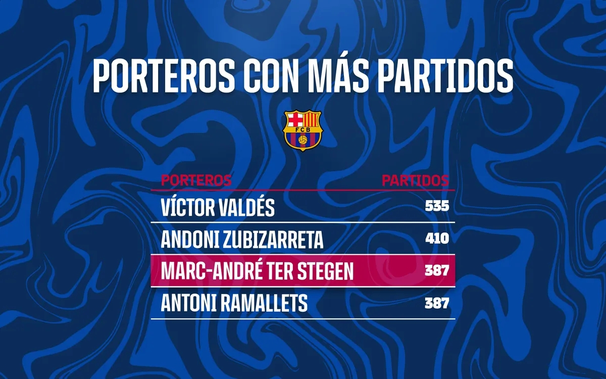 在巴萨队史门将登场次数排行榜上,巴尔德斯以535场位列第一,苏比萨雷塔以410场排名第二。对阵波尔图比赛即将登场的特尔施特根将追平拉马莱茨的387场并列第三。