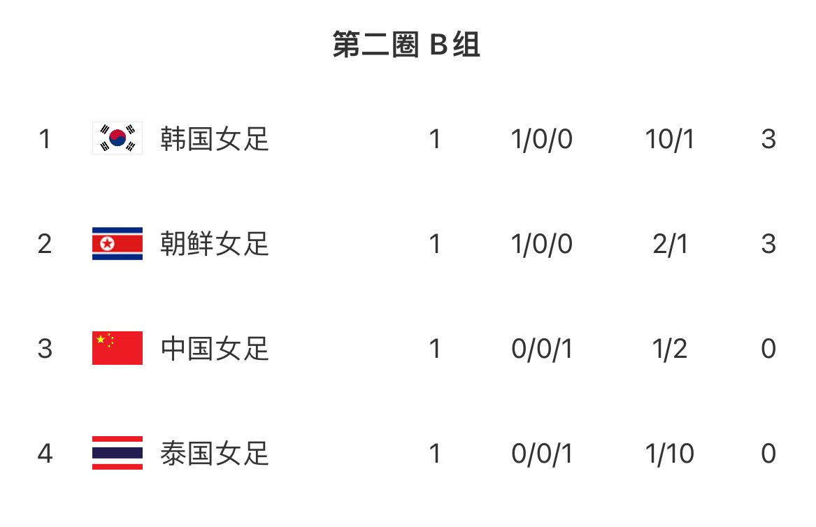 中国女足1-2不敌朝鲜女足,目前位列积分榜第三位,10月29日中国女足将战垫底的泰国女足,11月1日战韩国女足。
