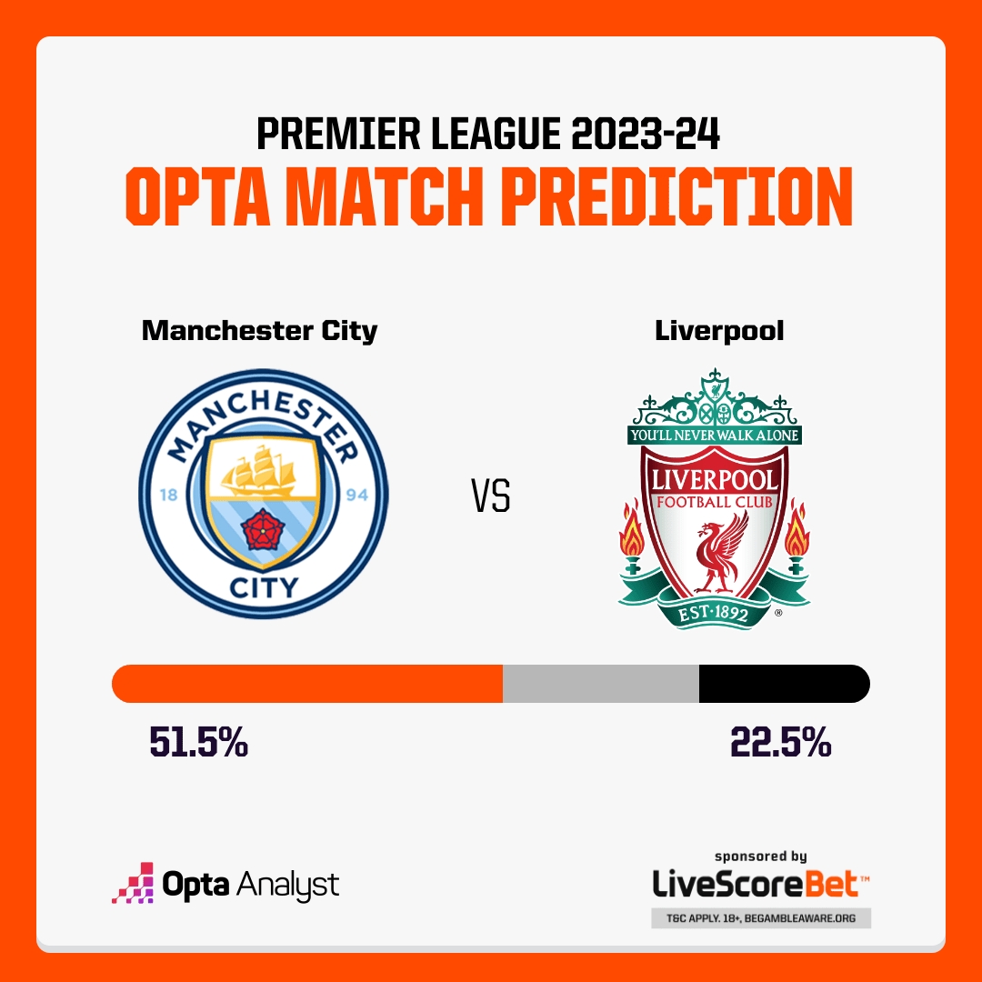 在10000场模拟比赛中,曼城赢了51.5%的比赛,利物浦的获胜可能则为22.5%,平局的可能性为26%。