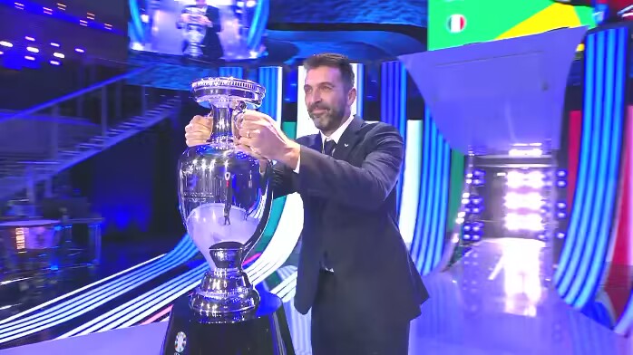 欧洲杯抽签仪式,意大利领队布冯捧奖杯入场🏆