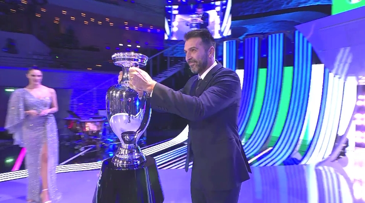 >欧洲杯抽签仪式,意大利领队布冯捧奖杯入场🏆