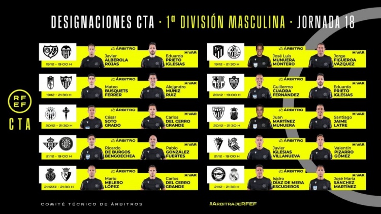 直播吧12月18日讯 西班牙足协公布了西甲第18轮各场比赛的裁判安排,具体如下:
