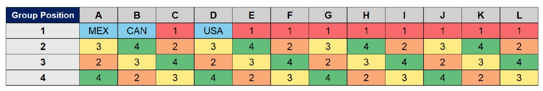 对于第一档的加拿大、墨西哥和美国这三个主办国,将用不同颜色的球来标识,抽签时,他们将被分配到相应的位置:墨西哥(绿色球)进入A1位,加拿大(红色球)进入B1位,美国(蓝色球)进入D1位。