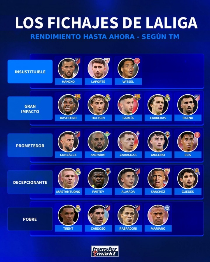 直播吧12月24日讯 德转对于今夏的西甲新援们进行了评级,其中拉什福德位列“顶尖”,阿诺德“拉完了”。