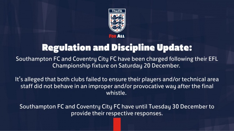 英足总发布公告,确认南安普顿与考文垂因12月20日英冠赛后行为被正式指控。两家俱乐部均未能确保其球员及/或技术区工作人员在终场哨响后避免不当及/或挑衅性行为。南安普顿与考文垂需在12月30日前各自提交回应。