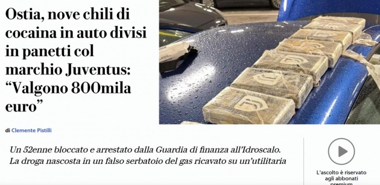 在随后的搜查中,调查人员在车辆备胎位置改装的一个假储气罐内发现了9公斤可卡因。引人注目的是,这些被压制成砖块状的毒品上均印有尤文图斯的标志。