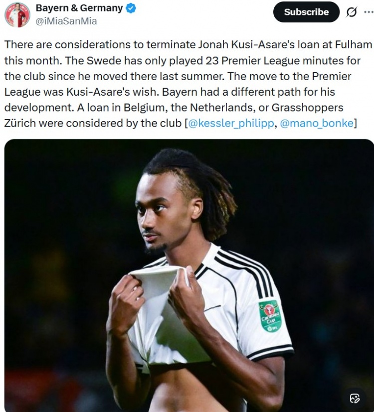 直播吧1月2日讯 据记者Philipp Kessler报道,富勒姆考虑在本月提前终止拜仁18岁前锋库西·阿萨雷的租借合同。