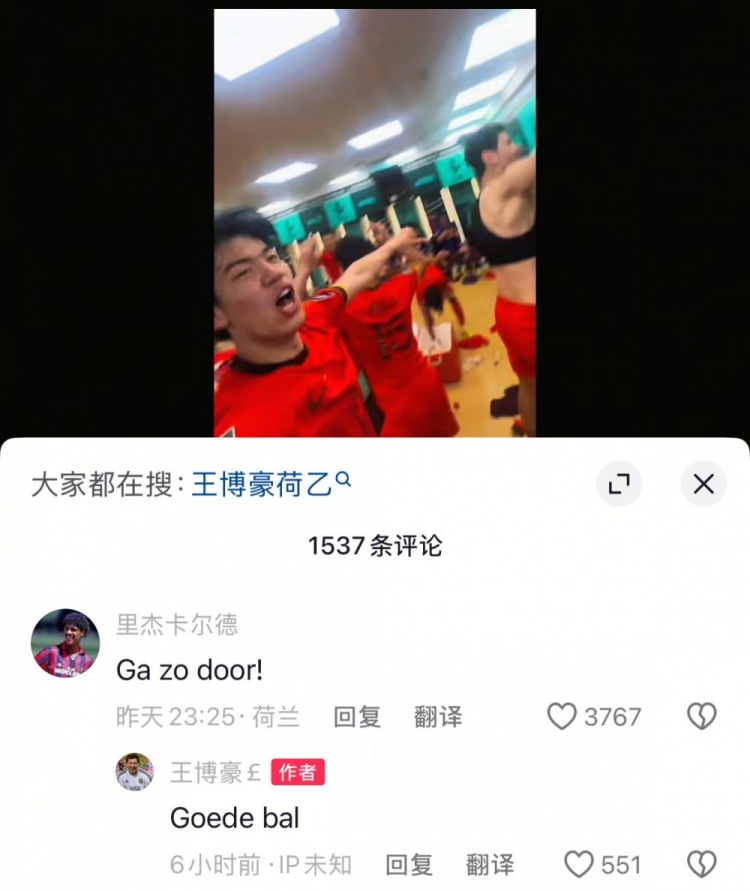 赛后王博豪在社媒晒出全队在更衣室庆祝的视频,荷兰传奇里杰卡尔德现身评论区互动,他评论道:“继续加油!”王博豪则是用荷兰语回复道:“好的!”