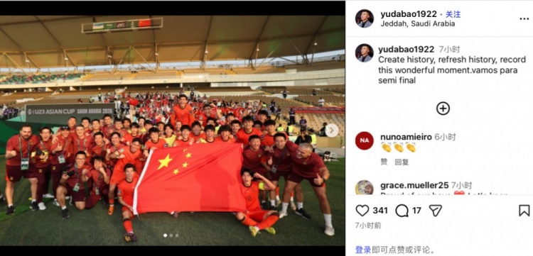 赛后U23国足助教、前国脚于大宝在社媒晒出了全队赛后合影和庆祝的照片,并配文写道:“创造历史、刷新历史,记录这个美妙的瞬间吧!半决赛冲冲冲!”