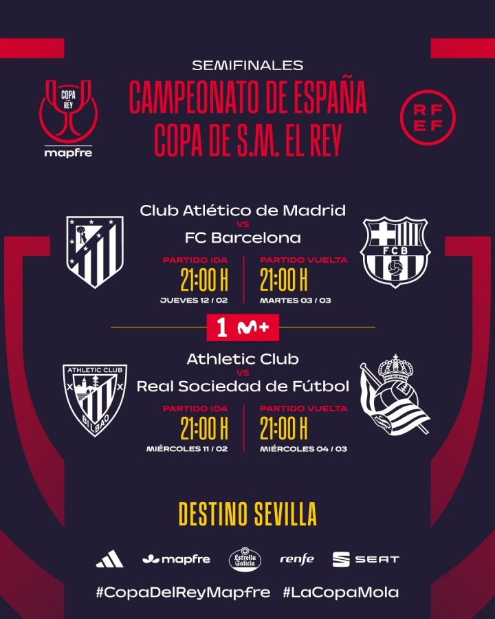 直播吧02月06日讯 国王杯半决赛对阵抽签今天进行,最终巴萨遭遇马竞,毕巴将对阵皇社。