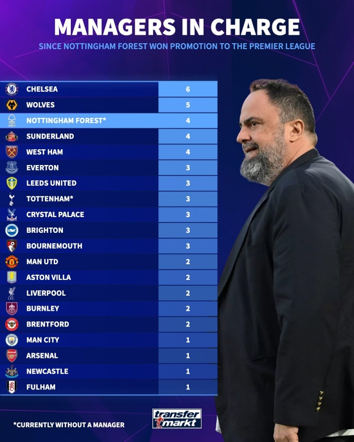 直播吧2月12日讯 诺丁汉森林官方宣布,主帅戴奇下课。德国转会市场统计了诺丁汉森林2022-2023赛季开始征战英超以来,英超各队的主帅人数,狼队7人最多,切尔西6人第二,诺丁汉森林4人并列第三,即将任命第5位主帅。