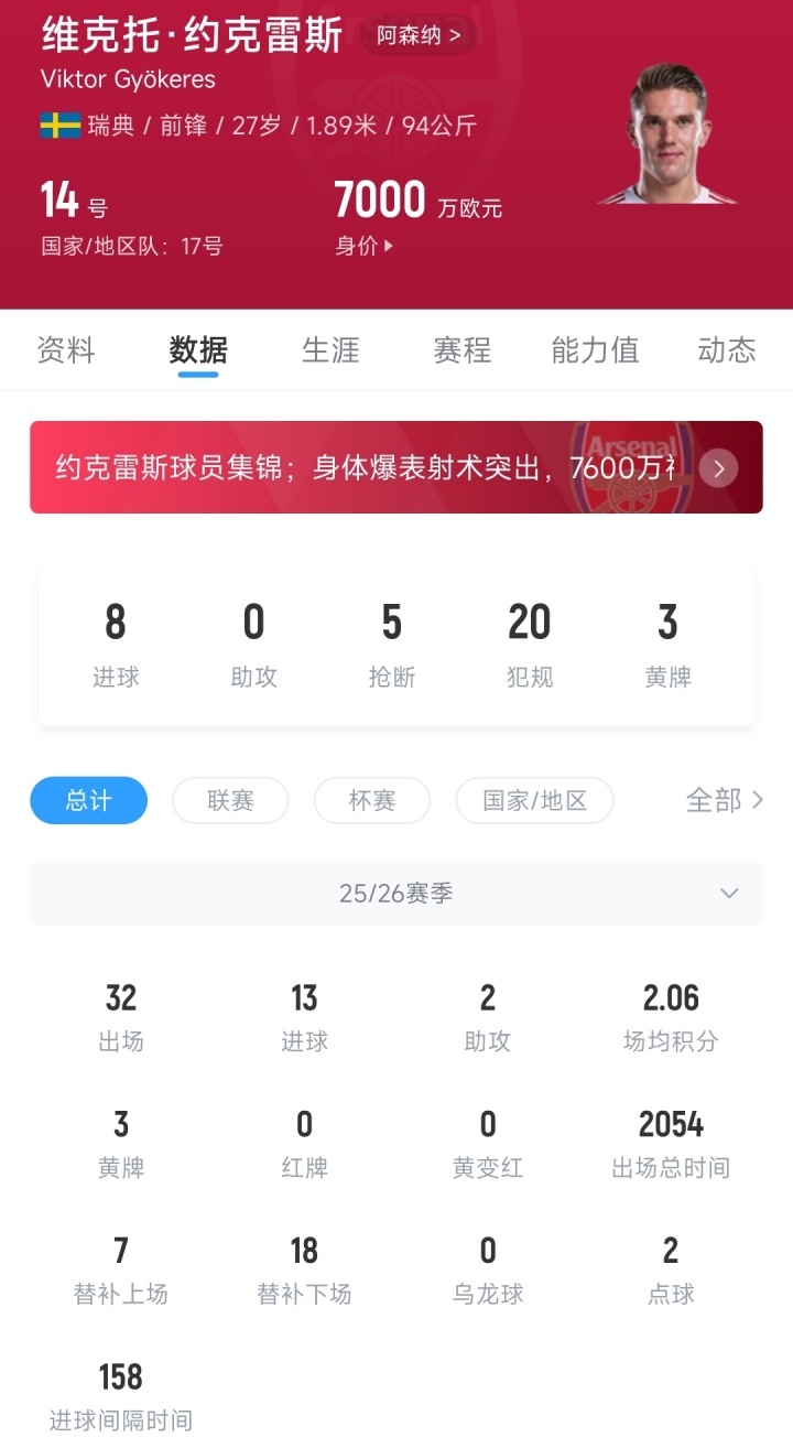 约克雷斯本赛季代表阿森纳出战32场比赛,在2054分钟的出场时间里贡献13粒进球和2次助攻;舍什科代表曼联出战23场比赛,在1283分钟的出场时间里贡献7粒进球和1次助攻。目前22岁的舍什科德转身价为6000万欧元,27岁的约克雷斯身价则是7000万欧元。