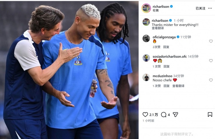 直播吧2月12日讯 热刺主帅弗兰克下课,里沙利松社媒与他告别。