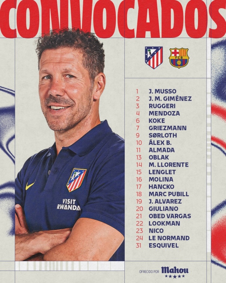 前锋:7-格列兹曼、9-瑟尔洛特、11-阿尔马达、19-阿尔瓦雷斯、20-朱利亚诺·西蒙尼、22-卢克曼、23-冈萨雷斯