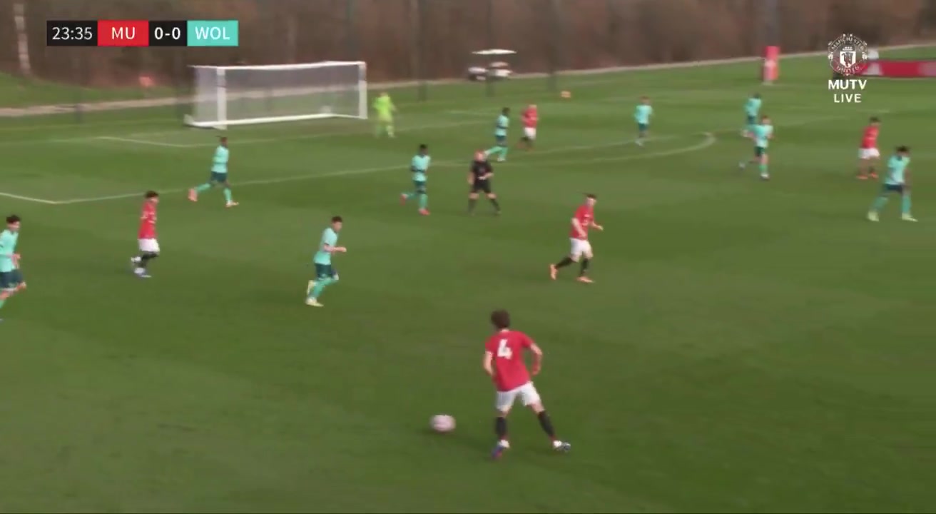直播吧02月21日讯 U18英超联赛,曼联U18对阵狼队U18。上半场比赛第24分钟,曼联15岁天才小将JJ·加布里埃尔打入一粒精彩的爆杆进球。
