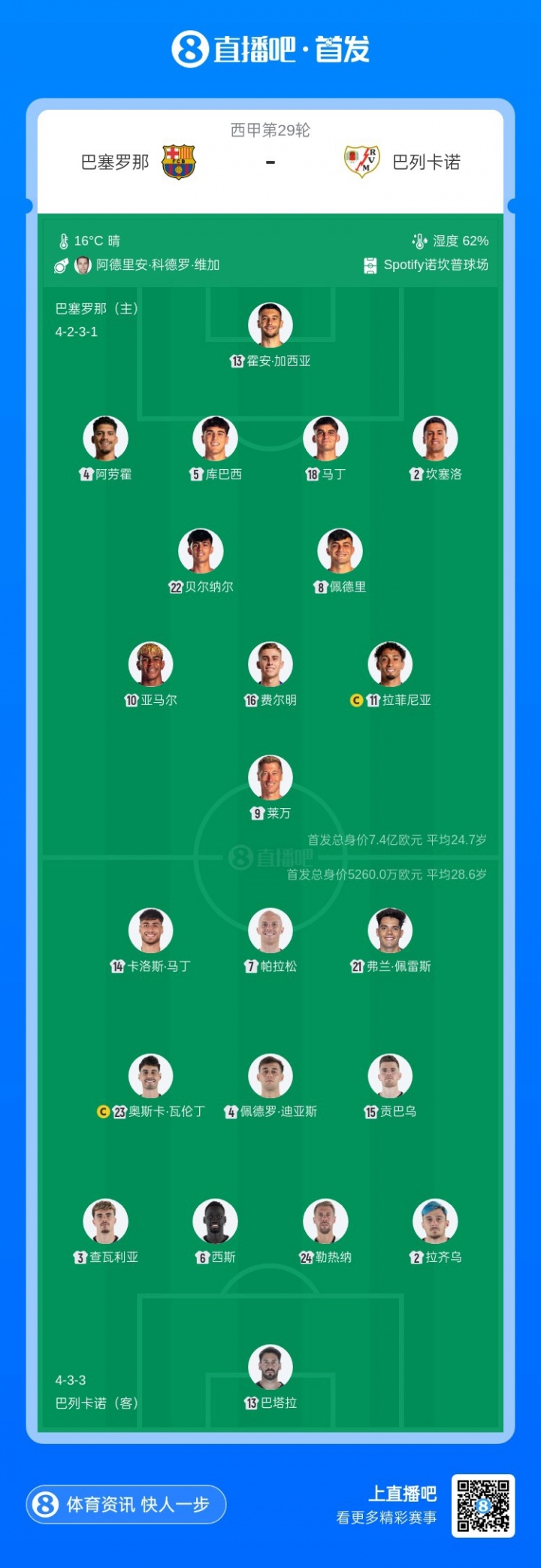 巴萨首发:13-霍安·加西亚、2-坎塞洛、4-阿劳霍、5-库巴西、18-赫拉德·马丁、8-佩德里、22-贝尔纳尔、16-费尔明、10-亚马尔、11-拉菲尼亚、9-莱万