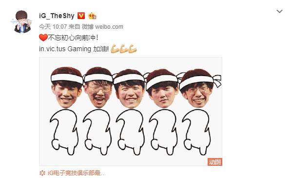直播吧9月5日讯 LPL季后赛已经将冒泡赛三支争夺S赛门票的队伍决出,IG首轮将迎战春季赛决赛对手JDG,在这关键时刻IG上单TheShy发布了S8总冠军五人组的动图为IG加油。