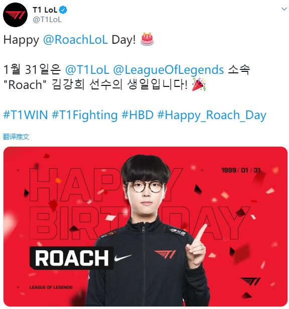 直播吧1月31日讯 今天是T1上单Roach的21岁生日,T1也是在推特上放出Roach的照片并祝福他生日快乐。