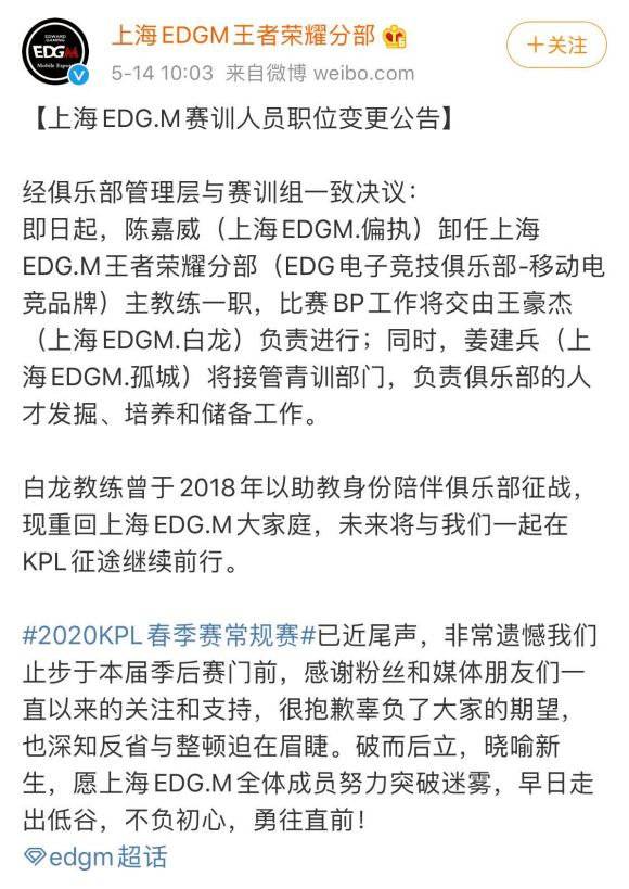 直播吧5月25日讯 早前OMG官方宣布了夏季赛阵容,其中EDG二队教练陈嘉威加入队伍。不过按照此前EDG的官方消息陈嘉威以前是以前是EDG青训队TF的教练,昵称是偏执。随后转型成EDG王者荣耀分部教练,在他的指教下EDG.M在上个赛季的KPL中排名垫底。