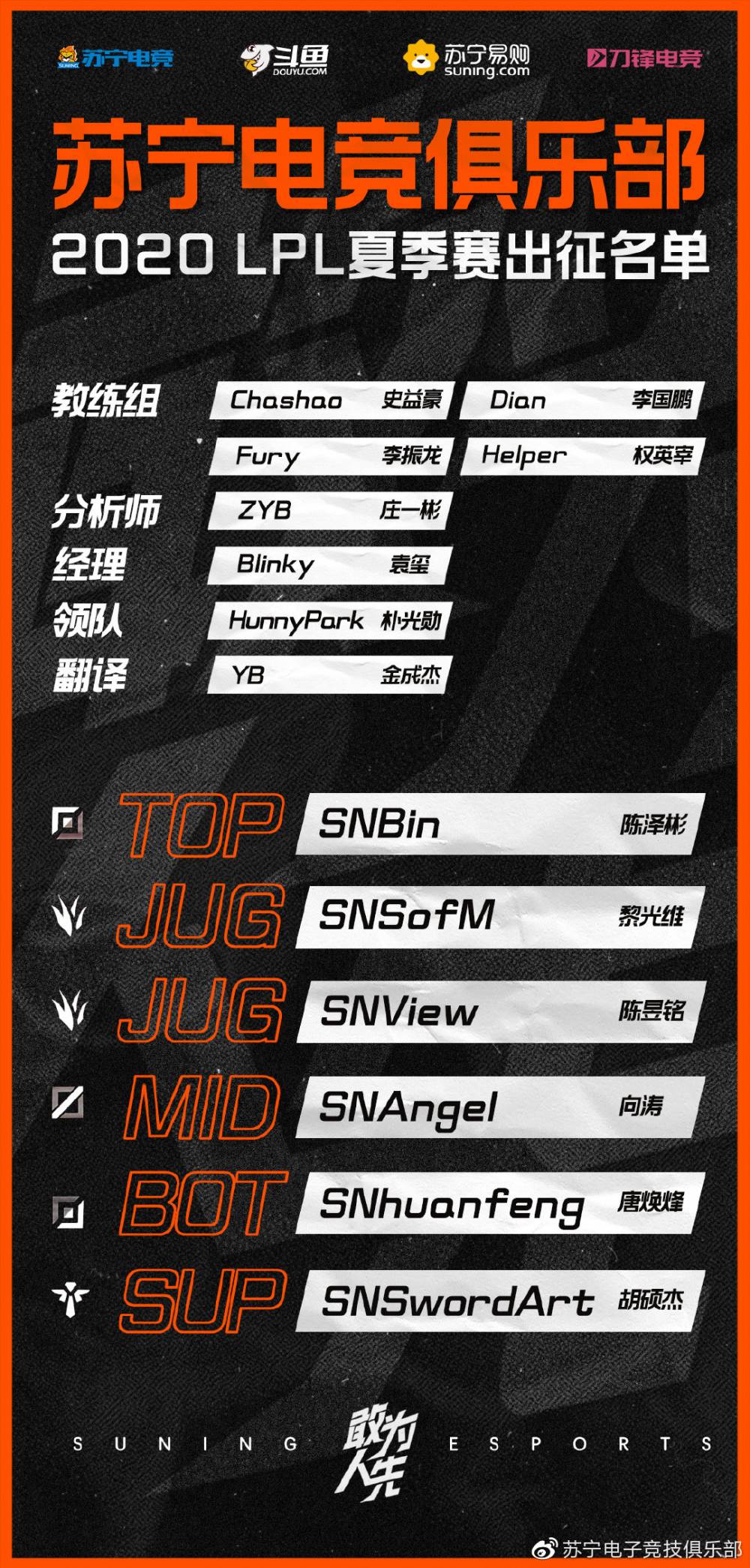 现正式公布苏宁电竞俱乐部英雄联盟分部2020LPL夏季赛大名单: