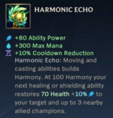 被动-回响和音:移动和施法会累积【和音】层数,在达到100层之后,你的下一个护盾或治疗技能将为目标和最多3个附近的友方英雄回复70+0.1法术强度生命值。
